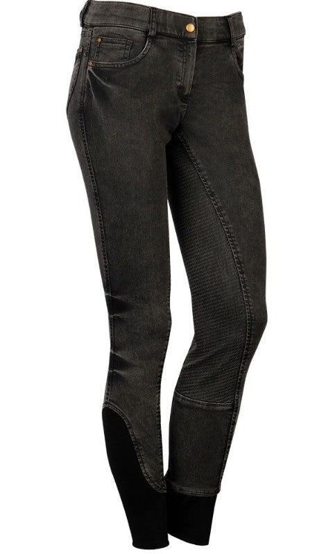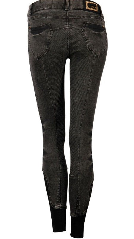 enim rijbroek met steekzakken en kontzakken beide voorzien van metalic studs. Rondgenaaid zitvlak voorzien van een siliconen print voor extra grip in het zadel, op de achterkant een clarino badge met crystallen, flexlegs voor extra comfort in de rijlaarzen 97% katoen / 3% elastan.